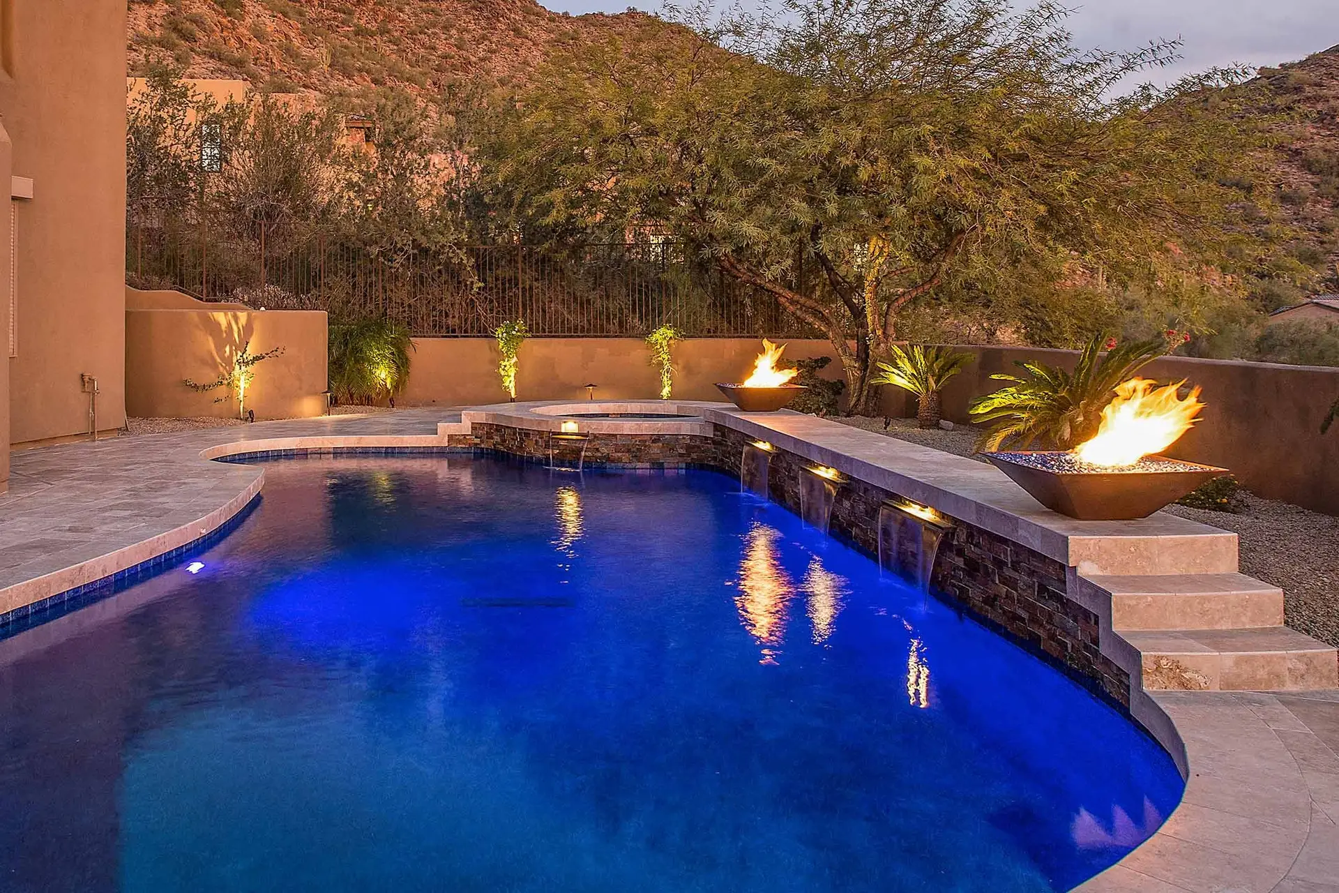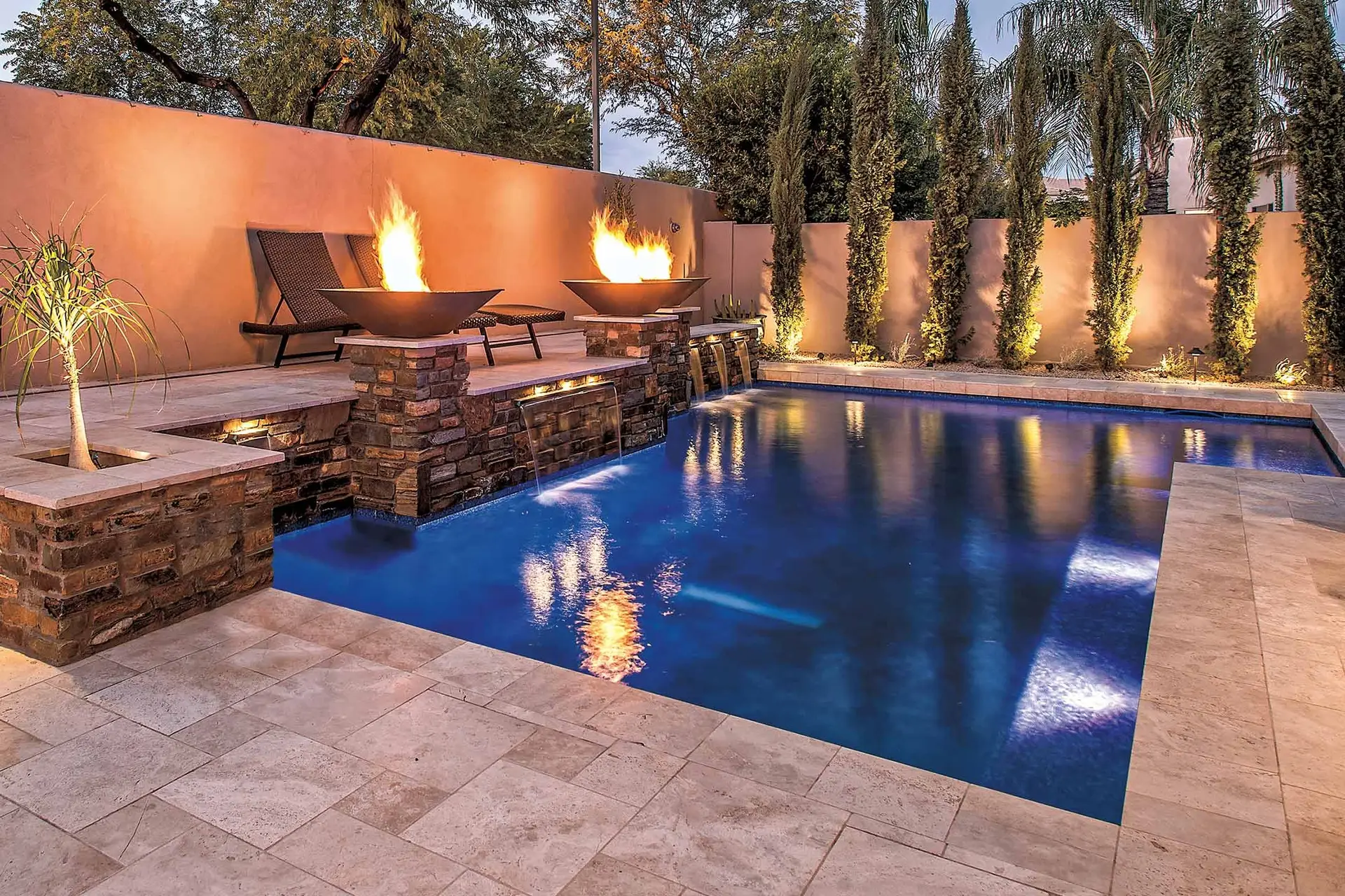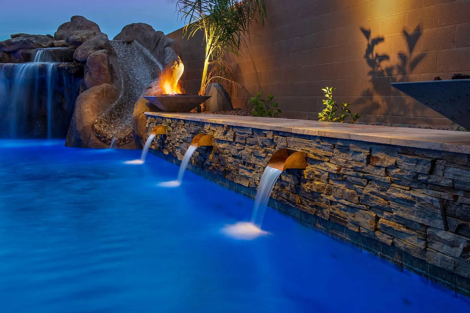 Enhance the elegance of your pool with our exclusive line of fire and water features. From water bowls and scuppers to planters and firepits, these American-made, artisan elements are available in a variety of natural stone and copper finishes to match the aesthetic of your outdoor space. Together, they will add a beautiful ambiance for family and guests to enjoy all year long.